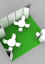 OBSAHUJE: ____konstrukce stěn octanorm výška 2,5 m + výstavářský koberec 20 m2 v barvách dle vzorníku ____vybavení stánku: 1x zázemí 1x1m, 1x pult, 1x barovka,